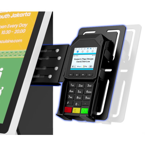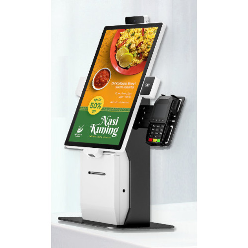 22"-os kijelzővel épített szabadon álló, pultra, állványra helyezhető önkiszolgáló kioszk. Vezérlését egy teljes értékű Android PC végzi. Beépített Wifi és kábeles LAN kapcsolat. Beépített blokk nyomtató és QR kód és NFC olvasó.